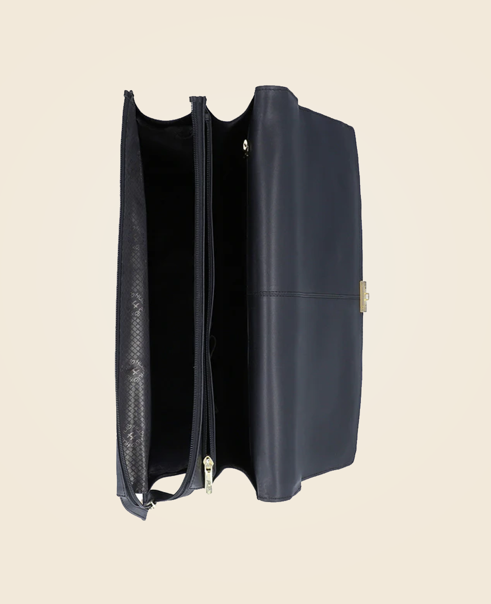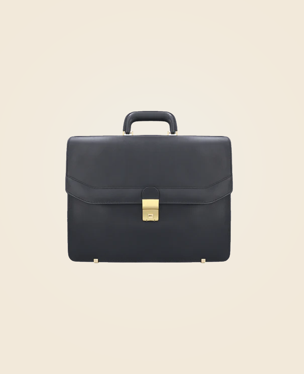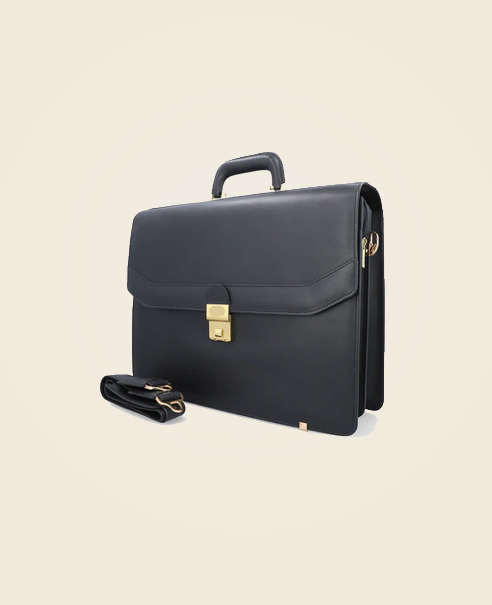 This luxurious black leather briefcase is the epitome of professionalism and style. Crafted from high-quality leather, it features a structured silhouette, a sturdy handle, and a sleek gold-tone lock closure for added security. The refined design makes it perfect for business professionals, executives, and entrepreneurs looking to make a statement. With ample interior space for documents, laptops, and essentials, this briefcase is both functional and stylish