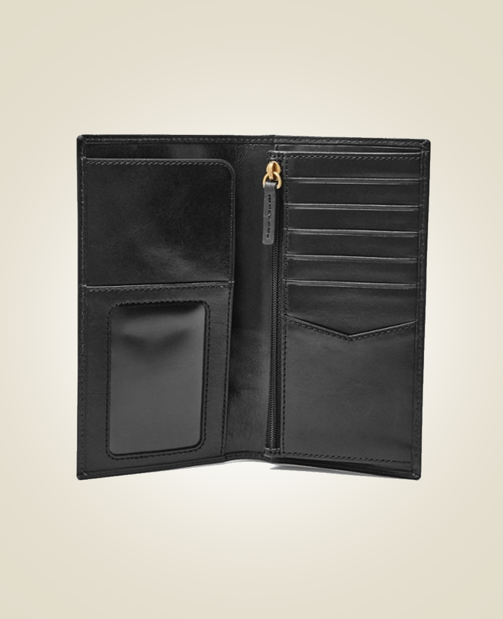 A sophisticated black leather travel wallet designed for organization and security. Featuring multiple card slots, a zippered compartment, and an ID window, it ensures convenience and style for business or leisure travel.
