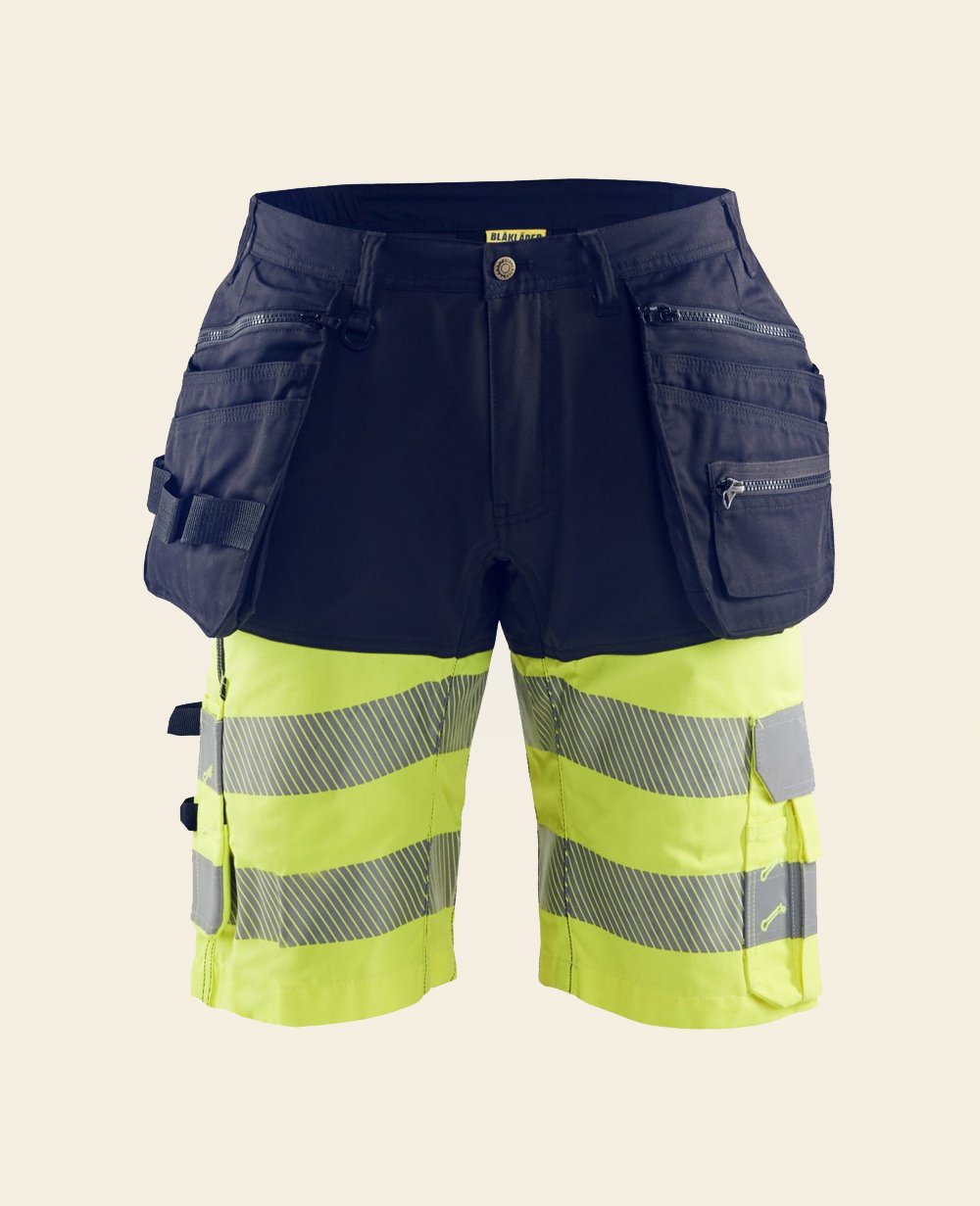 These high-visibility utility work shorts combine durability and functionality for professionals in demanding environments. Featuring a contrasting black upper section and bright yellow lower half with reflective striping, they enhance visibility and safety. Equipped with multiple zippered and reinforced pockets, tool loops, and sturdy belt loops, these shorts offer ample storage and convenience. Designed for comfort and mobility, they are ideal for construction workers, electricians, and other tradespeople.