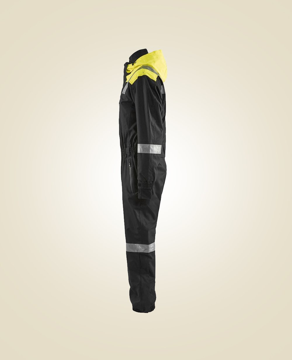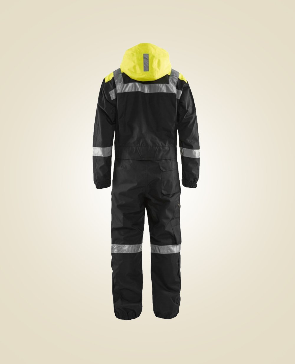 Stay protected in harsh conditions with this high-visibility waterproof coverall. Featuring a durable black and yellow design with reflective strips for enhanced visibility, this one-piece suit offers full-body protection against wind, rain, and cold. The elastic waist and adjustable cuffs provide a comfortable fit, while multiple pockets ensure functionality on the job. Ideal for outdoor work, construction, and industrial environments.
