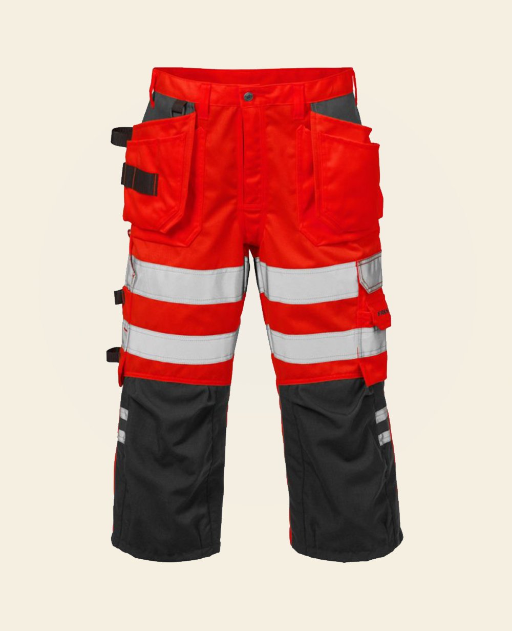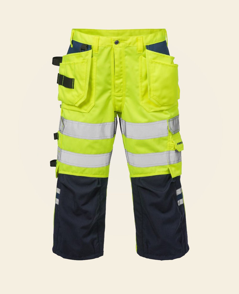 These durable, high-visibility work shorts provide comfort and safety for demanding work environments. Featuring bright yellow/orange fabric with reflective stripes, they enhance visibility in low-light conditions. The multiple reinforced pockets and tool loops offer practical storage solutions, making them ideal for construction, utility, and maintenance workers. The rugged fabric ensures durability, while the knee-length design allows for greater mobility.