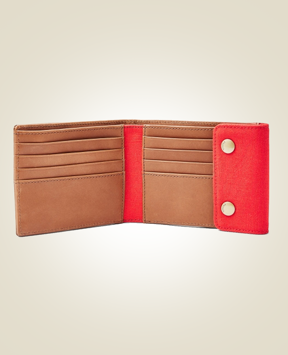A modern and vibrant bi-fold wallet featuring a unique combination of tan leather and bold red fabric. Equipped with multiple card slots, secure snap-button closure, and a spacious design, this wallet blends fashion with functionality for everyday convenience